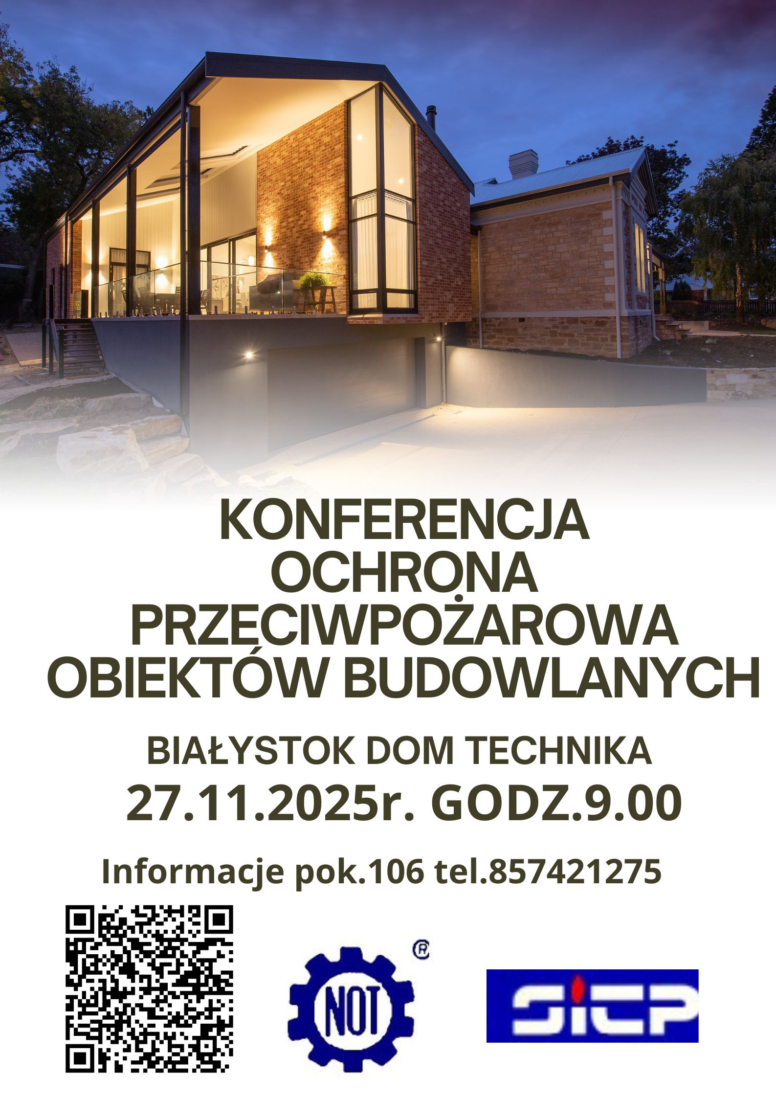 Stowarzyszenie Inżynierów i Techników Pożarnictwa Oddział w Białymstoku i Rada Federacji Stowarzyszeń Naukowo-Technicznych NOT zapraszają do udziału w konferencji. Karta uczestnictwa dostępna: https://bialystok.enot.pl/szkolenia/60/konferencjaochrona-przeciwpozarowa-w-obiektach-budowlanych